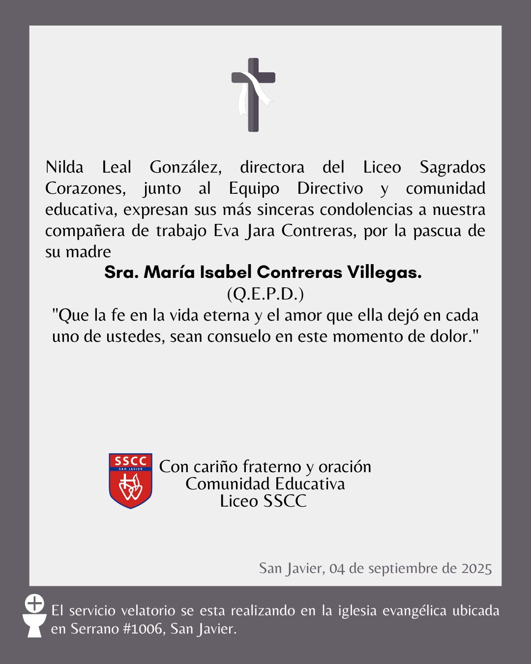 La comunidad educativa del Liceo Sagrados Corazones, se une en oración por el eterno descanso del alma de la madre de nuestra querida compañera de trabajo, Eva Jara Contreras: