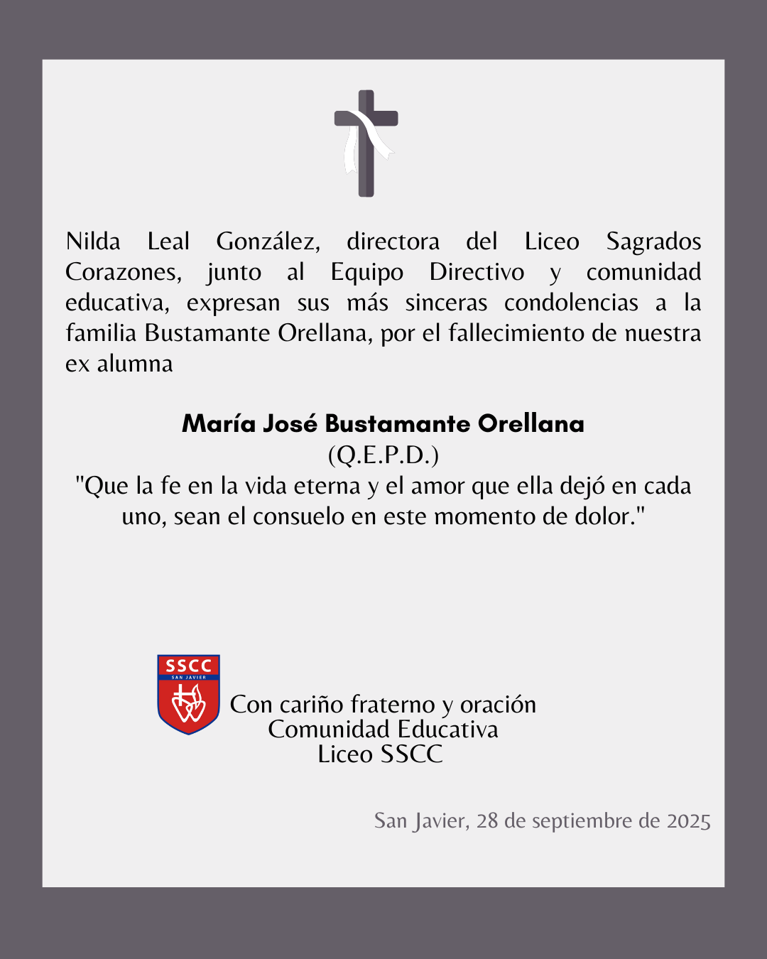 Como comunidad educativa lamentamos el fallecimiento de nuestra ex alumna María José Bustamante Orellana. Nuestra querida Jo, se destacó por ser una joven amigable, alegre y con espíritu de servicio. Características que se ven reflejadas en las infinitas muestras de cariño que se han visto ante su pronta partida y que la destacan como una mujer generosa, de calidez humana, alegre y excelente mamá.